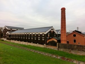 高瀬川の岸辺に建つ一際目を引く、八角形の赤い煙突とレンガ造りの蔵。
